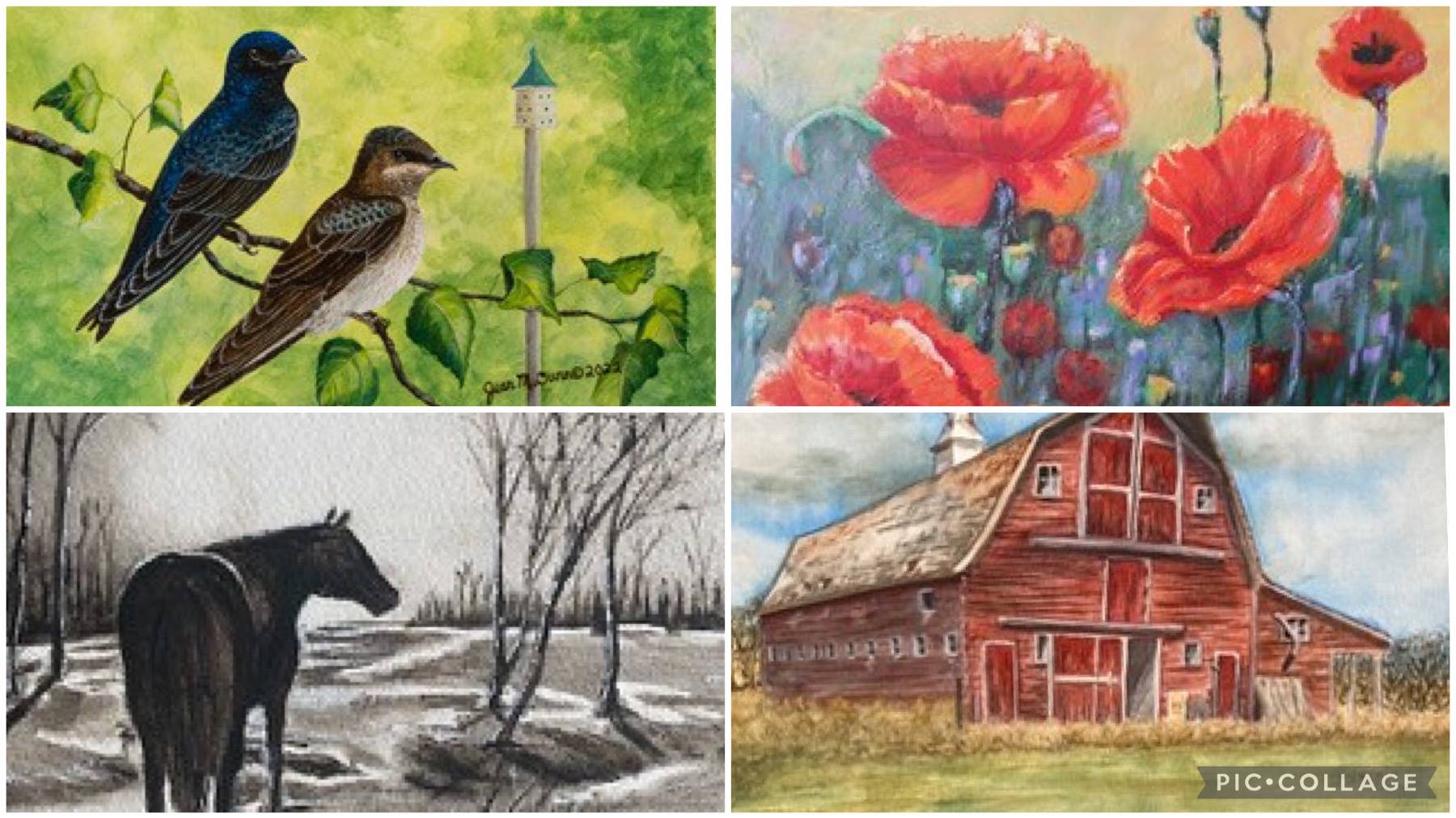 Shown are some of the pieces in the exhibition, clockwise from bottom left, Horse by Kathy Smith, Blue Birds by Jean M. Dunn, Poppies by Rosemarie Stadnyk, and Barn by Grace Gerein. (Submitted/North Battleford Galleries)