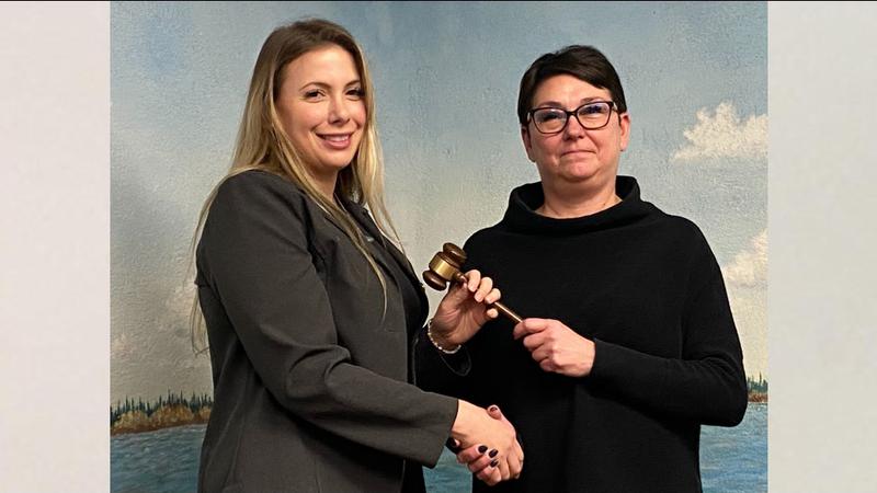 Outgoing chair Kayla Petersen, right, passes the gavel to incoming chair Glenda Rye, left, at the induction ceremony on Tuesday. (Angela Brown/battlefordsNOW Staff)