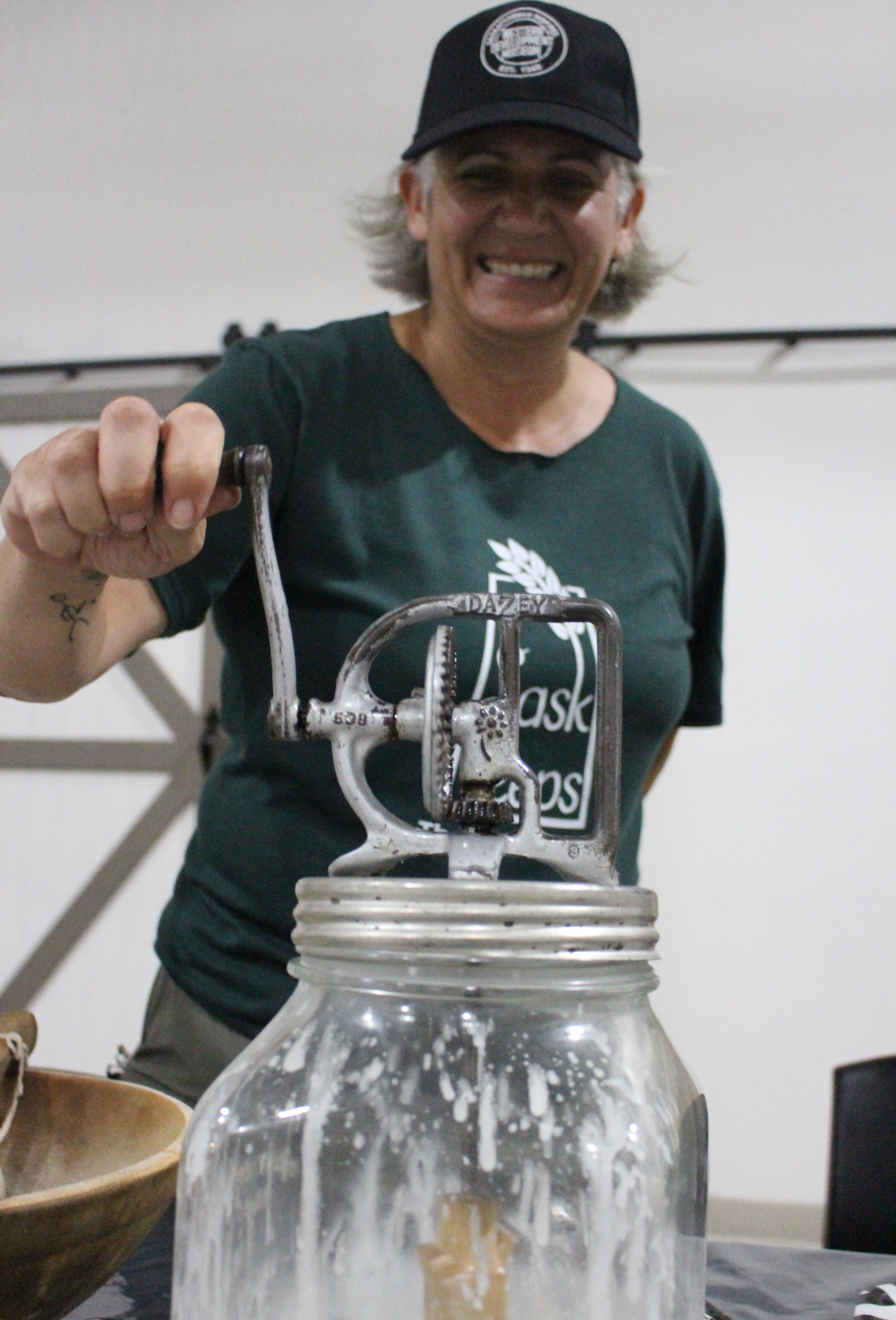 Heather O’Neill, programs and volunteer coordinator demonstrates how to make butter at the Western Development Museum’s History of Motion event on Sun., Aug. 18. (Julia Lovett-Squires/battlefordsNOW Staff)