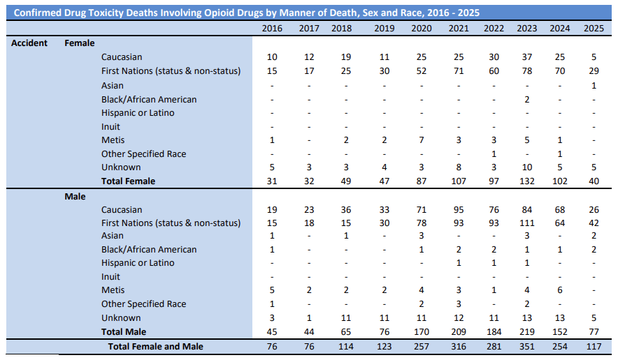 In 2024, five Caucasian women/girls died of overdose, a significant divergence from the 29 First Nation’s women and girls. One woman of Asian descent died and five other women or girls of unknown ancestry.
