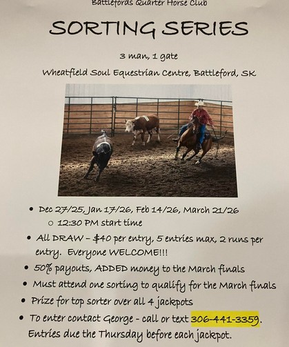 Here is your reminder to get your entries in to George by Thursday Jan. 15/26 for the sorting Jackpot Saturday, Jan 17/26 at Wheatfield Soul Equestrian Centre.