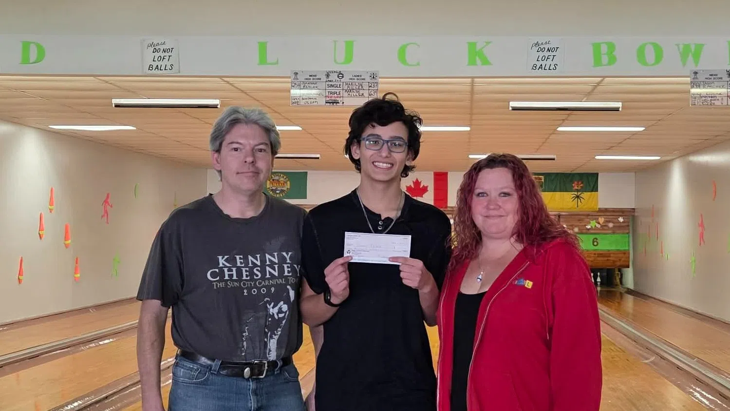Tanner Pollock, middle, receiving an award for a perfect game from Biggar Bowl owner, Melissa Raschet, right. (Image Credit: Biggar Bowl/ Facebook)