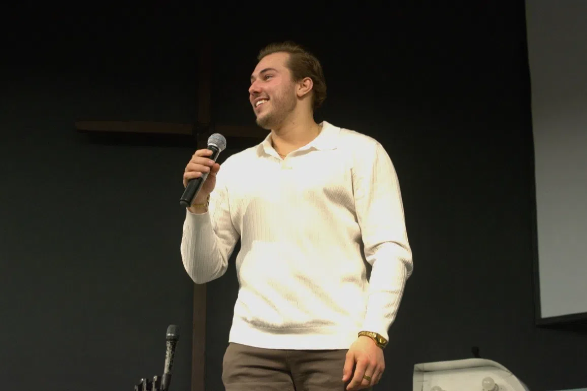 Kaleb Dahlgren, a survivor of the 2018 Humboldt Broncos bus crash, speaks to students during a mental health summit at Living Faith Chapel on Thursday, Feb. 26, in North Battleford. (Image Credit: Kenneth Cheung/battlefordsNOW)