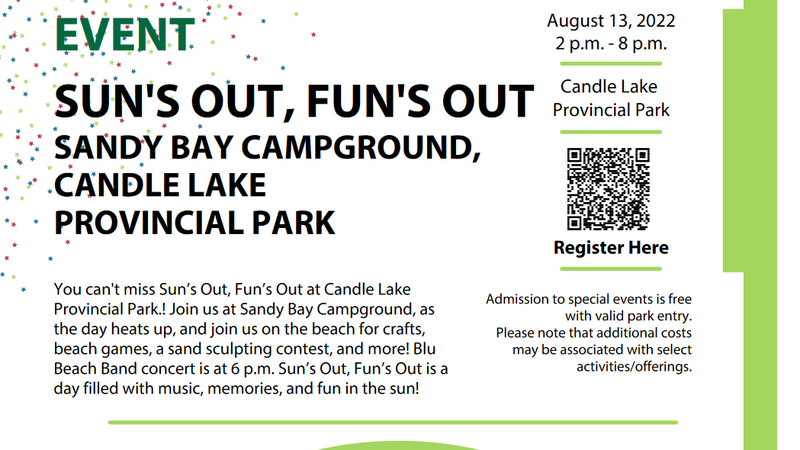 SaskParks is hosting an event at Candle Lake Provincial Park on August 13th. Sun's Out, Fun's Out at Sandy Bay Campground will be August 13th.See the poster for details.