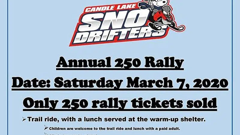 The 18th Annual Candle Lake Sno'Drifters 250 Rally will be Saturday, March 7, 2020. Tickets are available from Michelle Lozej 1-306-981-3777 or Carla Painchaud 1-306-960-5597. Payment method Cash/Cheq...